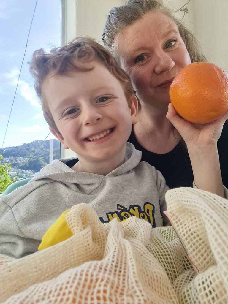 * The photo shows me with my son Elliot, who will be helping me remember to take reusable produce bags!